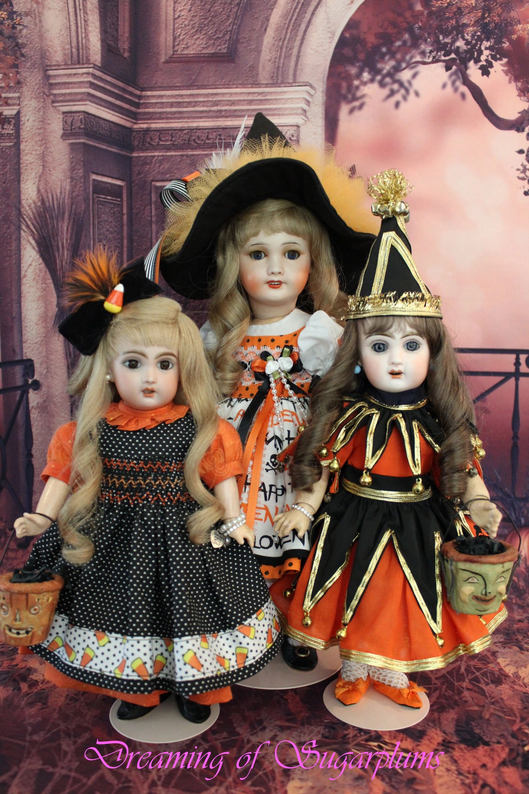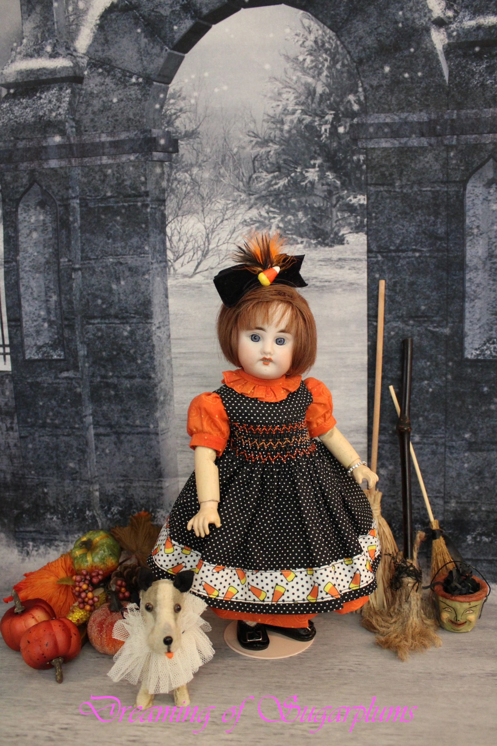 ~ Halloween Smocks Deguisement ~ Virginie (Gigi) Elizabeth is modeling this darling "All Hallows Eve" ensemble. Gigi is an antique 1905 Bleuette 6/0. She is as cute as can be with her chubby cheeks and her beautiful blue eyes! ~