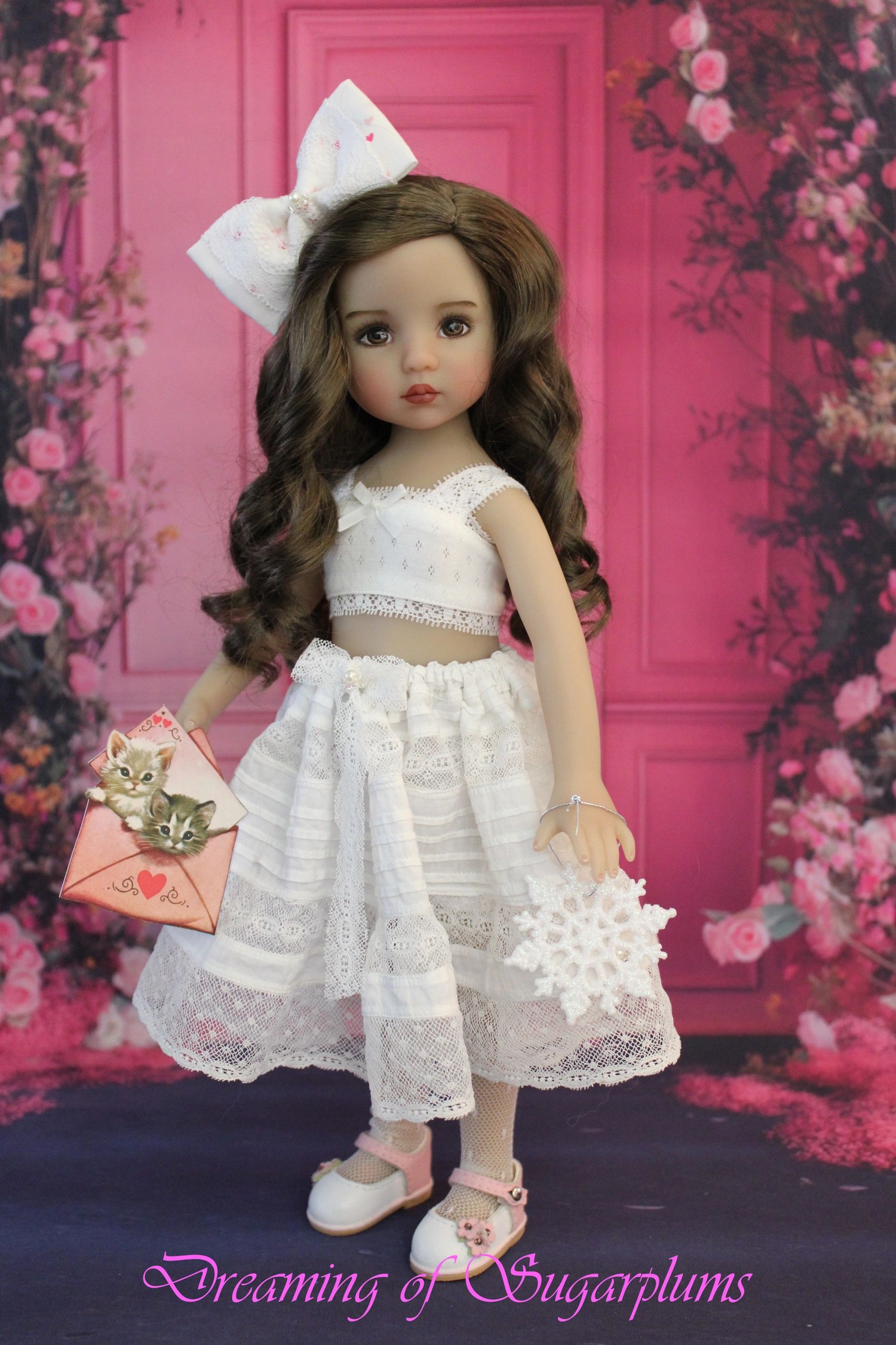 ~ OOAK Valentine Charm ~ This magical February ensemble was so delightful to create. It involved many hours of detail work, a lovely Madeira hem embellished with French heirloom lace accented with hand sewn pearls and tiny glass beads. Ella Beth with her gorgeous brown eyes was painted by Magalie and is my lovely model. Her hand smocked dress displays tiny shimmering glass beads within the smocking stitches. Silk bows with long tails embellish the front and sides of the dress. ~